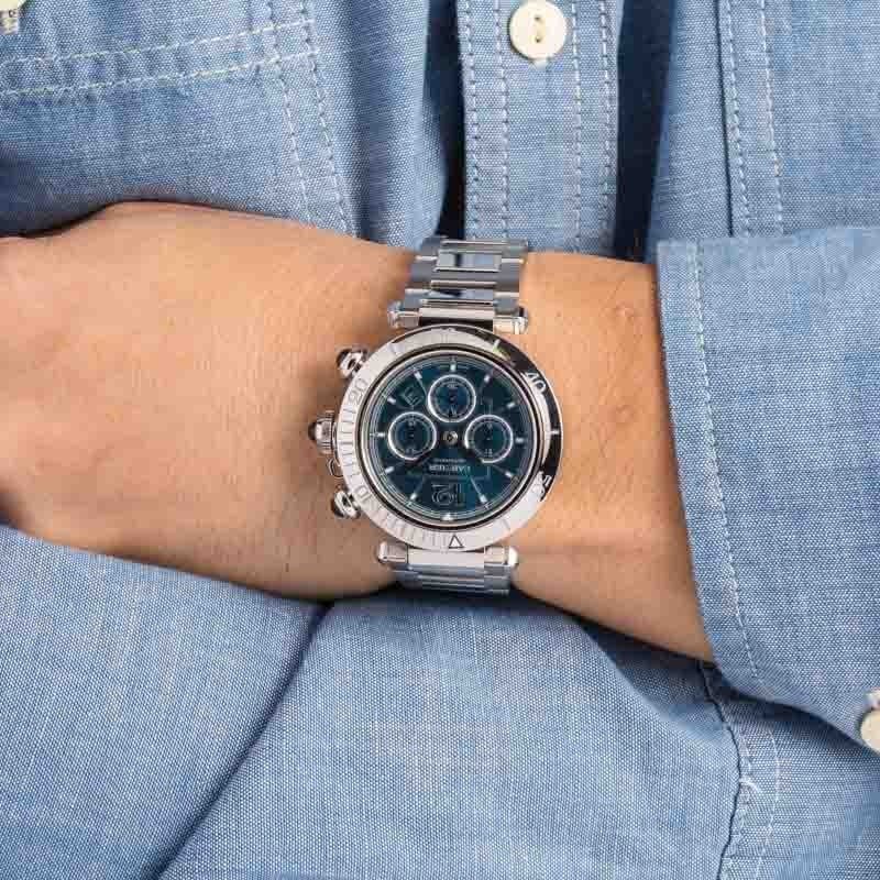 Bold, sophisticated, and unmistakably Cartier, this pre-owned Pasha WSPA0039 combines iconic design with high-performance chronograph functionality. The striking blue sunray dial, signature screw-down crown cap with spinel cabochon, and in-house Caliber 1904-CH MC movement make it a standout choice for those who appreciate precision, style, and heritage in equal measure.