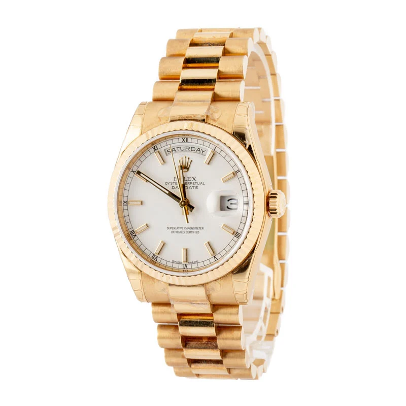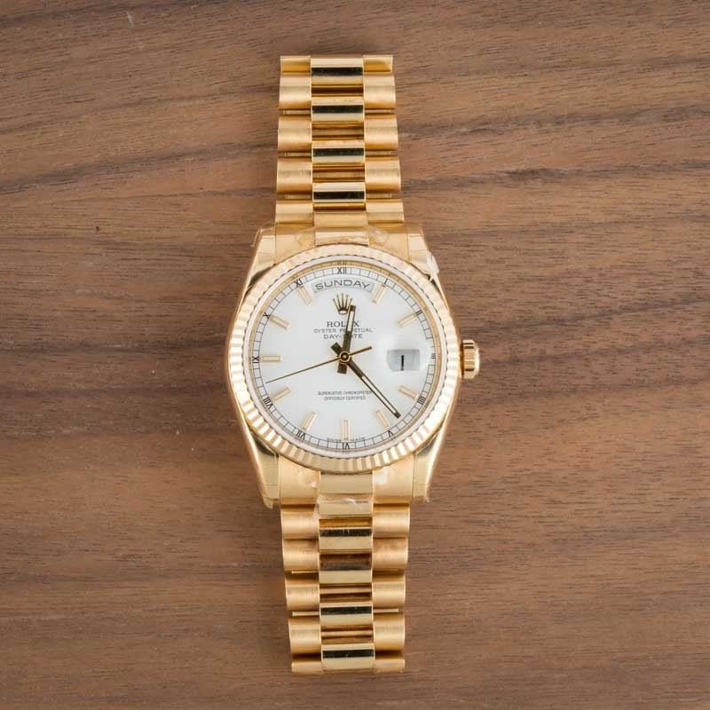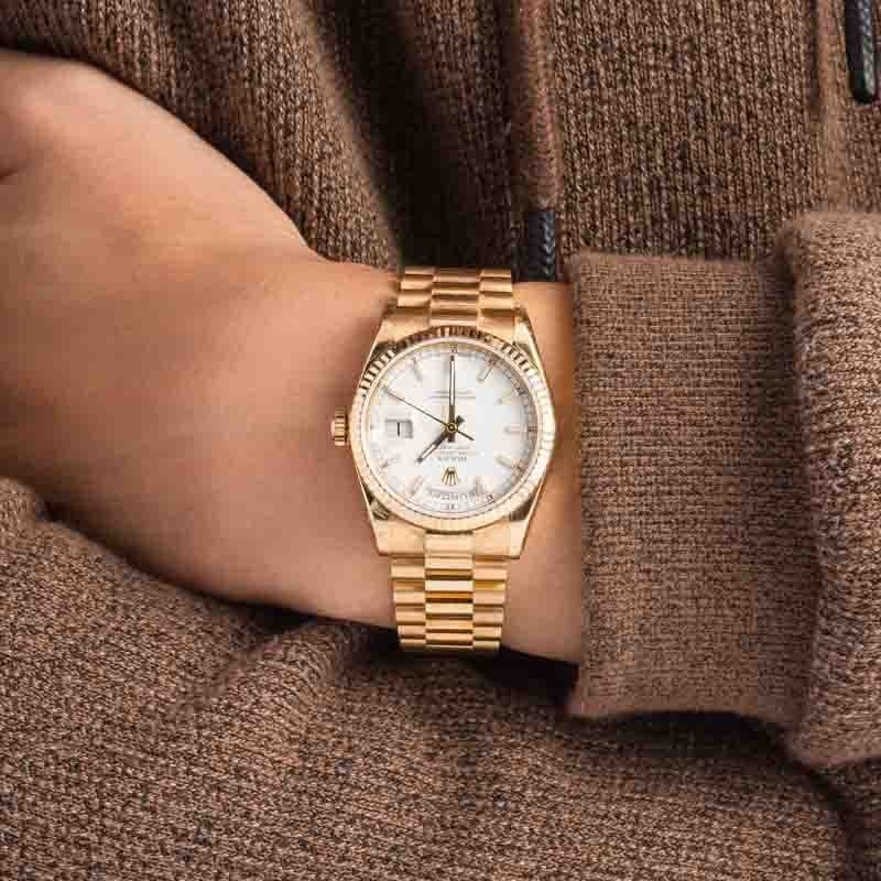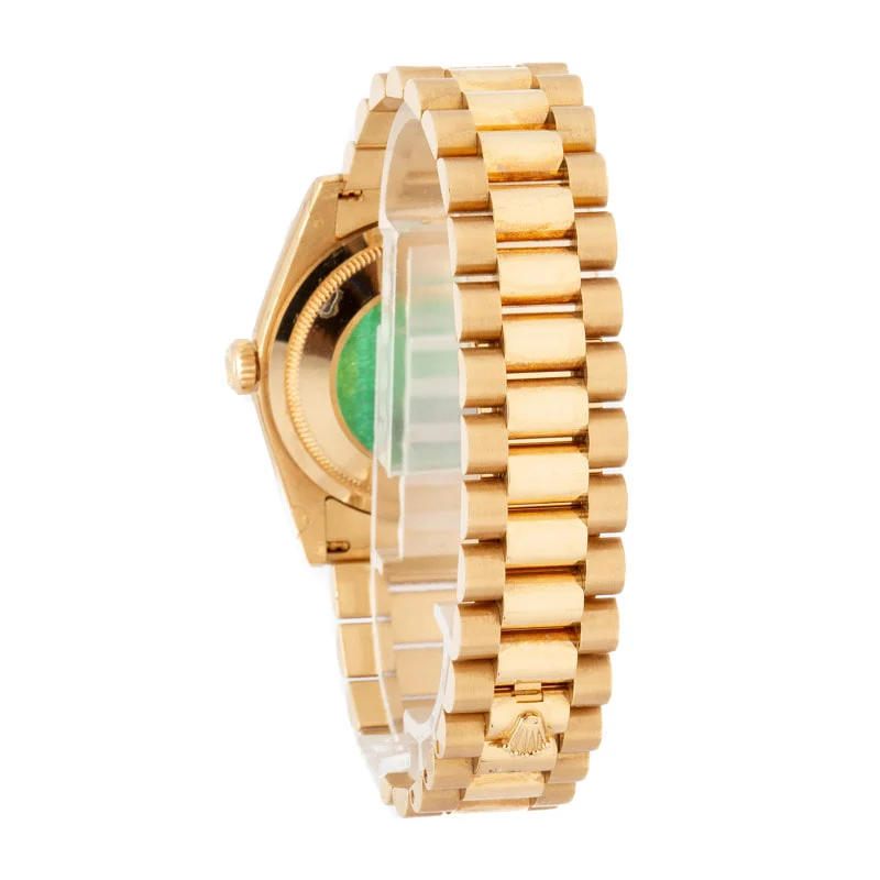 Rolex Day-Date 36 ref. 118238 (2005-2006) was a product of the early aughts, replacing the collector’s favorite, ref. 18238, and bringing with it several contemporary upgrades. The bracelet is heavier, featuring solid links, and it features a newer-style hidden Crownclasp.
